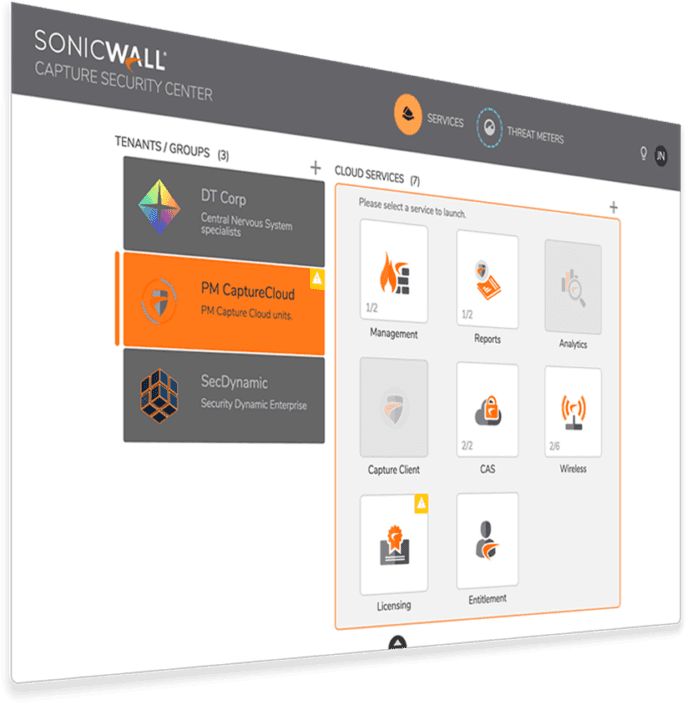 Capture Security Center is a scalable cloud security management system that’s a built-in and ready to use component of your SonicWall product or service. It features single-sign-on and ‘single-pane-of-glass’ management. It integrates the functionality of the Capture Cloud Platform to deliver robust security management, analytics, and real-time threat intelligence for your entire portfolio of network, email, endpoint, mobile, and cloud security resources.