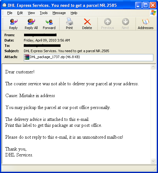 Bredolab DHL and Facebook spam continues (Apr 9, 2010)