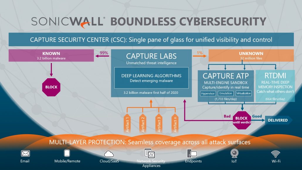 Anbei eine schematische Darstellung, über welche Einfallstore Angriffe üblicherweise stattfinden und wie das Konzept der Multi-Layer-Protection von SonicWall im Rahmen der Boundless Cybersecurity diese abwehrt: