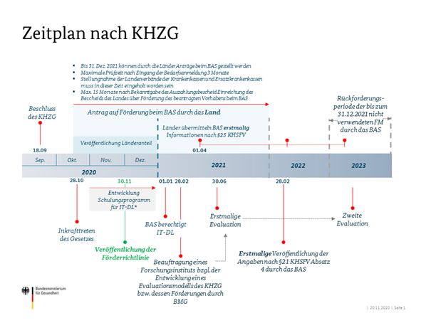 Das Krankenhauszukunftsgesetz, über dessen Basis nach dem Beschluss seit dem 01.01.2021 die Gelder ausgeschüttet werden, soll die Digitalisierung der Infrastruktur in Krankenhäusern vorantreiben. Mit dem Gesetz wird das durch die Koalition am 03.06.2020 beschlossene „Zukunftsprogramm Krankenhäuser“ gefördert und das KHZG ist am 29.10.2020 offiziell in Kraft getreten.