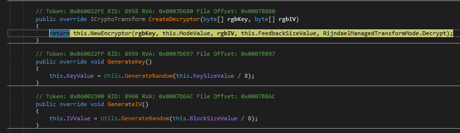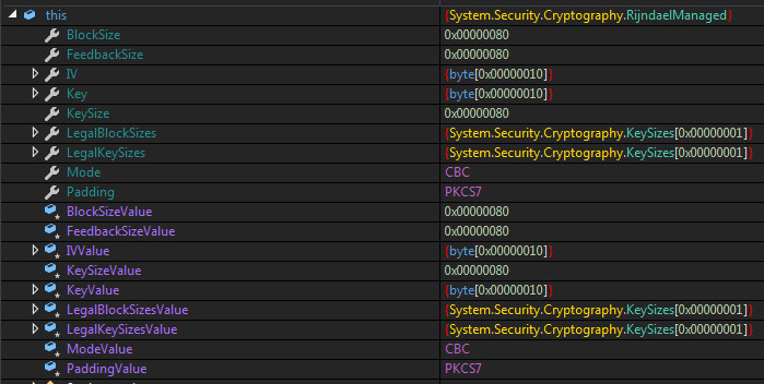 The encryption used is called "Rijndael" selected by (NIST) as the candidate for the Advanced Encryption Standard (AES). The key and IV, uses 16 bytes or you can say it's 128 bit. The mode used is called "CBC" which stands for "Cipher Block Chaining". The Sample also uses RSA Security LLC standard called "PKCS7". The Cryptographic Message Syntax Standard.