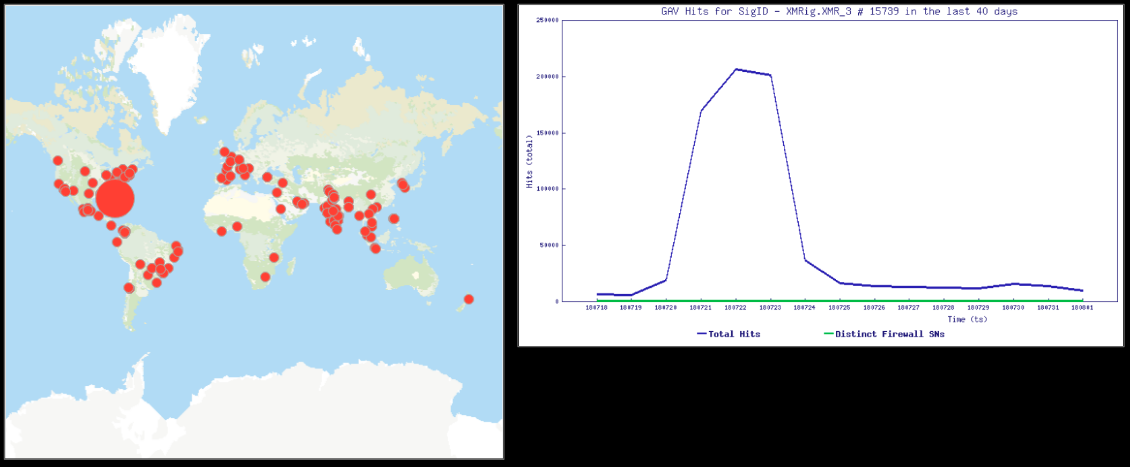 Images below show the heat map for XMRig.XMR_3 and the corresponding hits graph. As visible below, we saw a hit-spike for this signature in end of July: