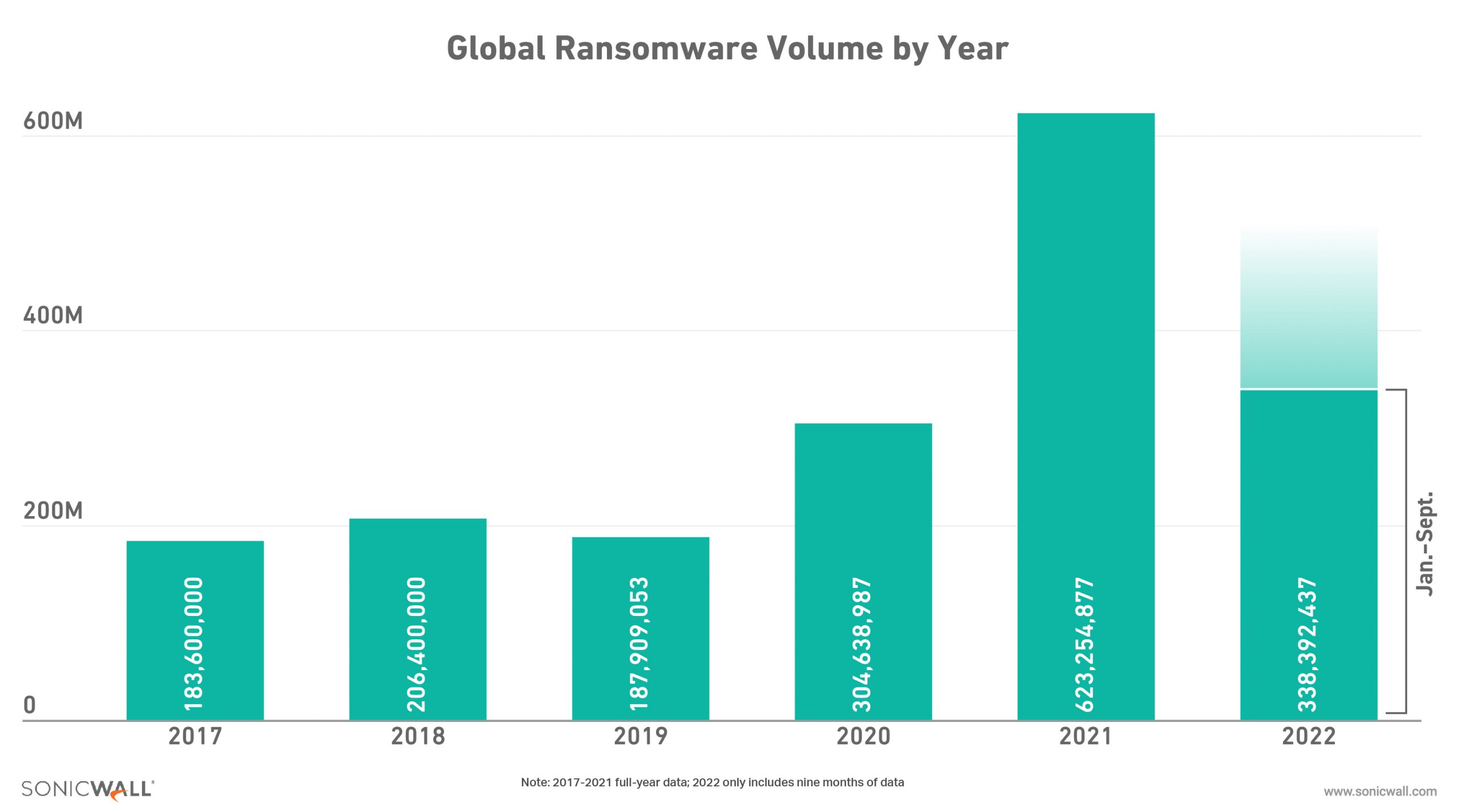 Im Vergleich zum Gesamtjahr 2021 befand sich das globale Ransomware-Volumen im dritten Quartal weiterhin im Rückgang. Die 338,4 Millionen Ransomware-Angriffe, die in den ersten drei Quartalen 2022 registriert wurden, stellen eine 31%ige Abnahme gegenüber dem Vorjahr dar und entsprechen im Durchschnitt 1.013 versuchten Ransomware-Angriffen pro Kunde.