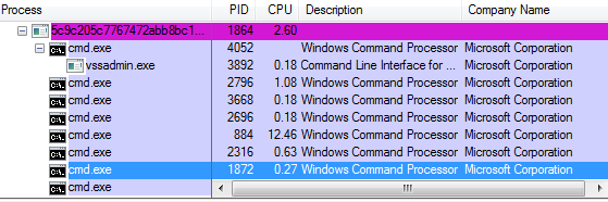 It was unclear how this ransomware arrives to a victim’s machine, but upon execution it spawns a number of cmd.exe instances to execute a plethora of commands – mostly to disable system services which include Antivirus, automatic updates, networking services, email services, removing mapped drives, backup and replication services just to name a few.