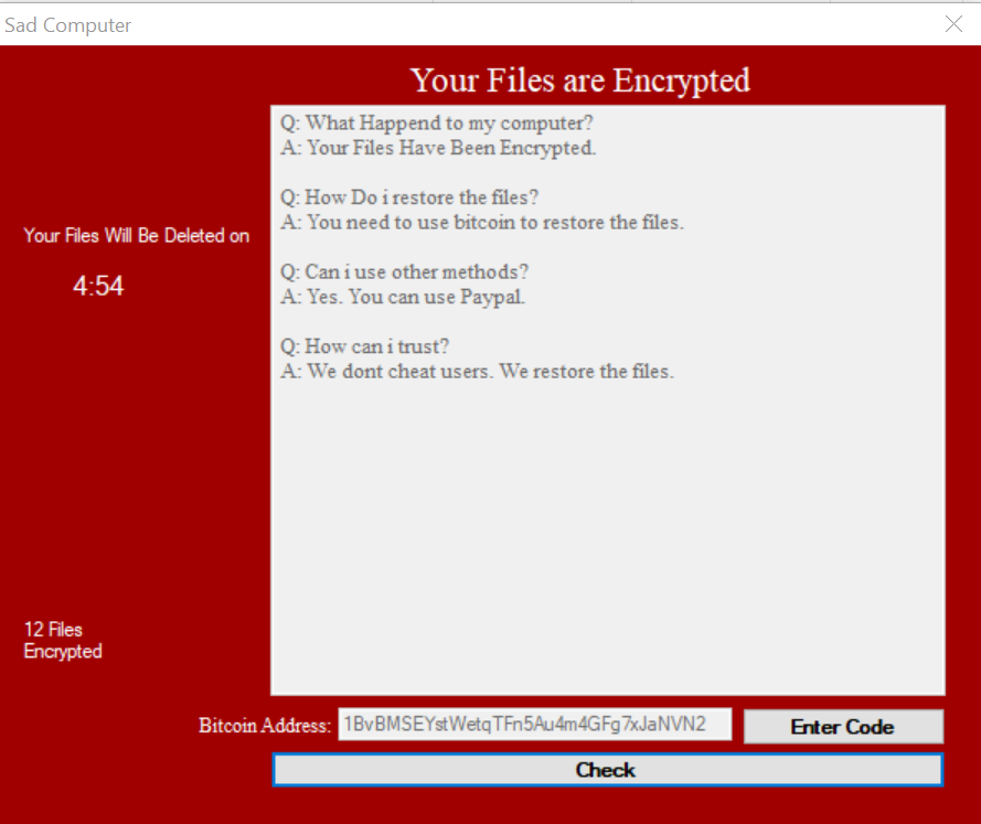 The SonicWall Capture Labs Threat Research Team have received reports of ransomware that appears to be in early development called SadComputer. Although the malware only gives its victim 5 minutes to pay, it also provides a way to recover the files without paying the ransom. We speculate that this variant is part of an early development release as the attackers seem to have provided a Bitcoin address that they do not control. The malware does however, permanently delete files after the time expires.