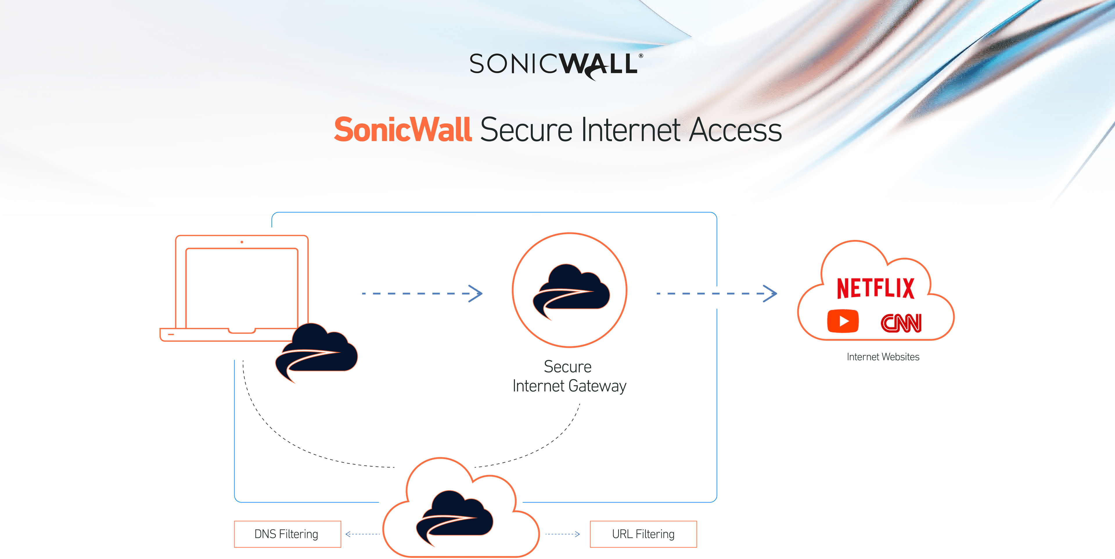 SonicWall Secure Internet Access delivers exactly that. With integrated Secure Web Gateway (SWG), risk-based URL filtering, and Cloud Access Security Broker (CASB), Secure Internet Access ensures safe access to the open internet without slowing productivity. Secure Internet Access filters harmful content at the DNS and web layers to block threats before they reach users, enforces acceptable use policies, and stops risky behavior.