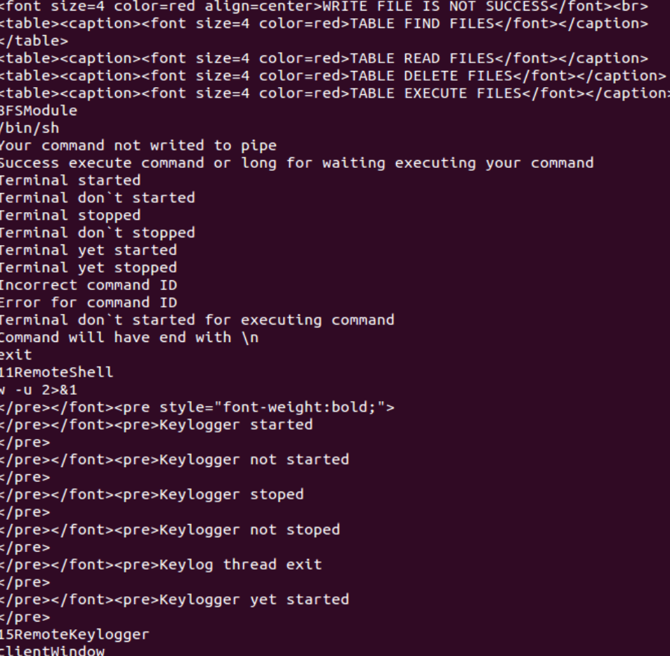 Looking further in its strings reveals additional capabilities of this Trojan like the ability of executing commands remotely, deleting and writing files and keylogging, among others.