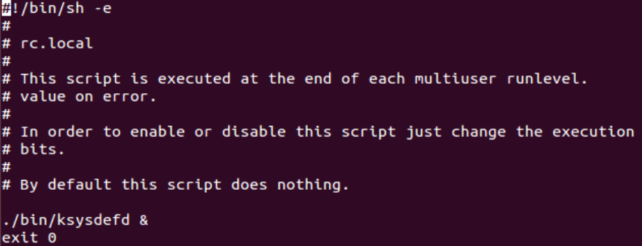 In order to ensure that it autoruns, it adds the strings "./bin/ksysdefd & exit 0" to the rc.local file in the /etc/ directory: