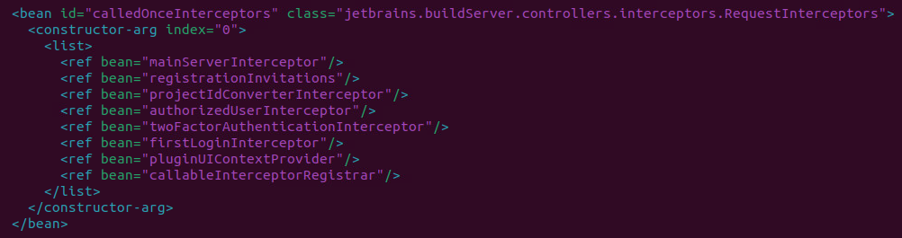 This configuration file buildServerSpringWeb.xml establishes interceptors, notably the calledOnceInterceptors bean, which manipulates incoming HTTP requests. This bean leads to the instantiation of the jetbrains.buildServer.controllers.interceptors.RequestInterceptors class, which features the wildcard path /**/RPC2. On instantiation, it integrates several beans, including the authorizedUserInterceptor, into its myInterceptors list.