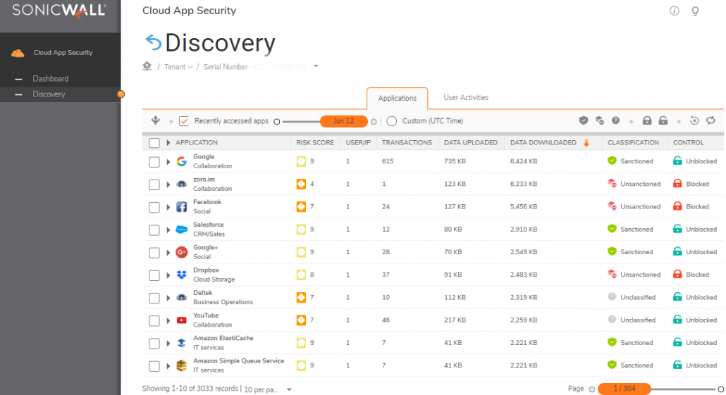 Diffusé via SonicWall Capture Security Center (SCC), Cloud App Security est disponible à titre de partie intégrante de l’offre groupée d’abonnement au logiciel SonicWall Capture Security Center Analytics. La solution s’intègre parfaitement à votre infrastructure SonicWall existante et s’appuie sur les journaux des pare-feu nouvelle génération (NGFW) pour assurer une fonctionnalité de type CASB qui apporte découverte, visibilité et contrôle par rapport à l’usage de toutes les applications cloud.