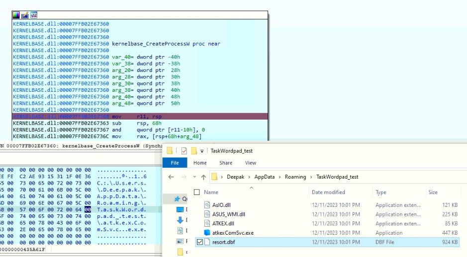 Next the malware drops ASUS software component files into “%APPDATA%\TaskWordpad_test” along with malicious DLL file “AsIO.dll.” The malware executes the “atkexComSvc.exe” which loads malicious DLL file “AsIO.dll” and further executes and injects Remcos malware into explorer.exe: