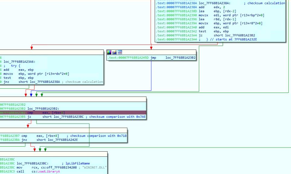 The malware retrieves its own executable file name and calculates a checksum value by adding each alphabet’s ascii value in the filename. If the checksum value is either 0x7AE or 0x718 then malware continues execution otherwise the malware terminates itself. The corresponding filename for the checksum value 0x7AE is “patchSvc_beta_v2.exe” and filename length must be 0x14. The filename length for checksum value 0x718 must be 0x12. Below is the code to calculate the checksum and filename length: