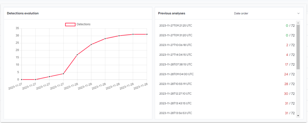 For the first few initial days when the sample was submitted to VirusTotal, it can be observed that there were virtually no detections, which only slowly improved over time. This shows that malware can evade ML/AI based security products during the initial days of propagation by hiding inside a legitimate application code.