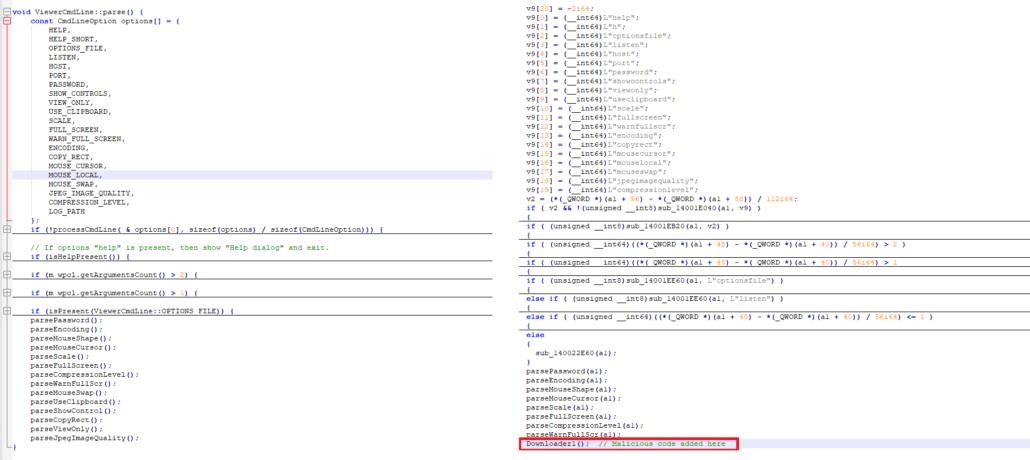 Fig-2: Left side is the original clean code and right side is the decompiled code from the malware