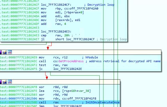 Initial 0x20 bytes from the downloaded PNG image file are used to decrypt the API name “InitOnceExecuteOnce”. The malware retrieves the address of API “InitOnceExecuteOnce” using GetProcAddress and invokes this API by passing argument of the next executable module of the malware. Because the API name is dynamically decrypted using the downloaded image file bytes, this acts as an anti-emulation / anti-analysis feature when the URL is not serving any data or is unreachable.
