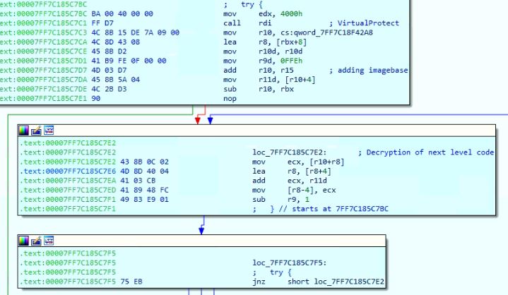 Next the malware resolves the address and invokes the “VirtualProtect” API by the same manner, it used to execute the “InitOnceExecuteOnce” API. The malware modifies the memory protection to PAGE_EXECUTE_READWRITE to decrypt the next layer code using a hardcoded key and again modifies the memory protection to PAGE_EXECUTE_READ before transferring control to the decrypted code: