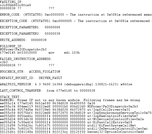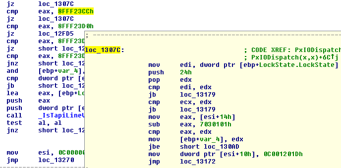 As you can see, the code 0x8fff23cc corresponds to the execution of the code in the box. Also note in the highlighted red box, 'eax' equals to 0x7030125 which is the value that was passed to DeviceIoControl function above as a part of the 'InBuff' [*(InBuf+5)]. Subtracting 7030101h from this gives 0x24. Let's try to figure that out by debugging the sample. Executing the sample produces a crash :-