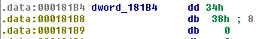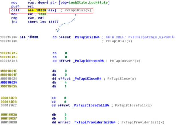 The call invokes in to an array with starting offset at off_18008. The index for the highlighted call is 'eax' which is 0x1b0 as you can in the state of the registers above. So, 0x18008 + 0x1b0 = 0x181B8. Looking at this address: