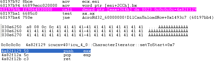 And it points to 0x38 - exactly the place where EIP was during the crash. Thus, the value 0x7030125 is chosen carefully to lead to this crash.