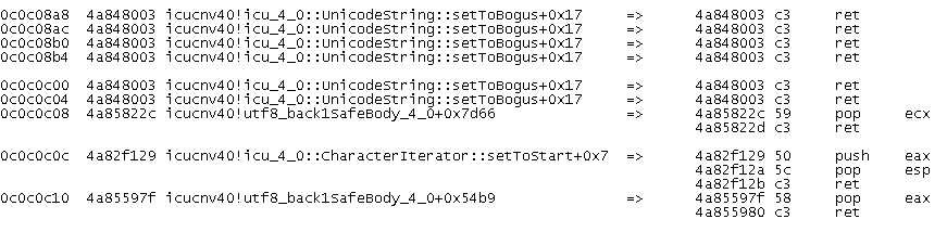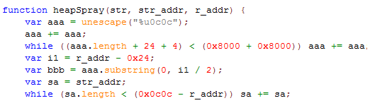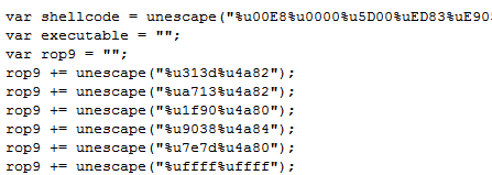 After De-obfuscation, we can see code-piece that has shellcode, heapspray, payload, ROP
