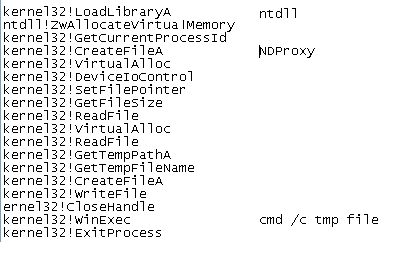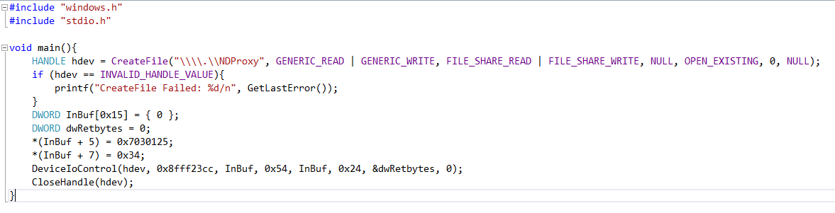 The 'CreateFile' function opens NDProxy through I/O. As quoted in MSDN - "NDPROXY is a system-provided driver that interfaces NDISWAN and CoNDIS WAN drivers (WAN miniport drivers, call managers, and miniport call managers) to the TAPI services." DeviceIOControl is then used to send the control code directly to NDProxy driver. The code here is 0x8fff23cc.