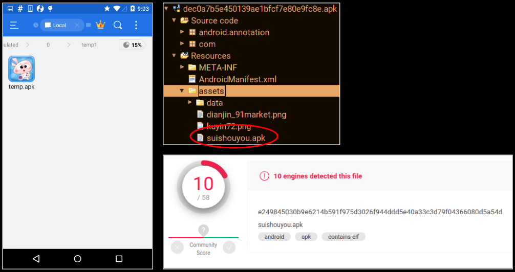 We observed this app was present in the assets folder and are locally stored at /storage/emulated/0/temp1/:
