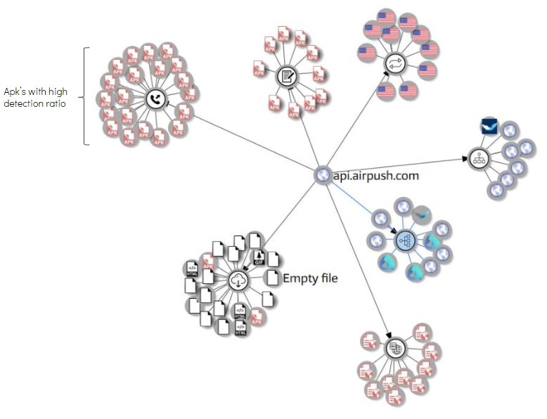 VirusTotal graph below for the domain api.airpush.com shows a large number of samples with high detection ratio communicating with this domain: