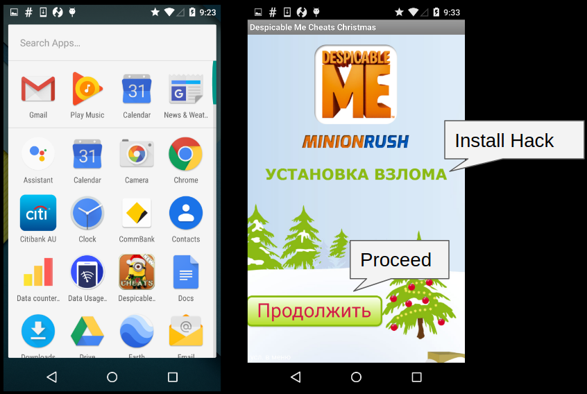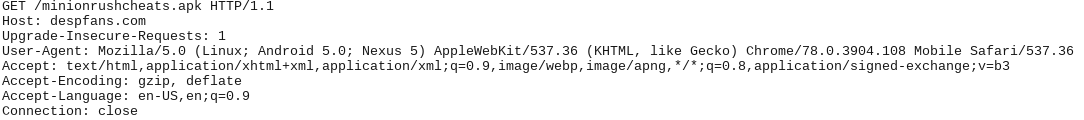 On clicking the 'proceed' button a GET request goes out to despfans.com/minionrushcheats.apk. This domain is currently down so the apk was not downloaded: