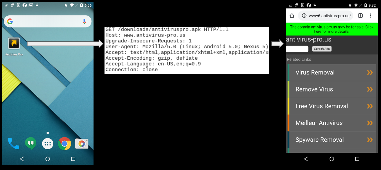 Like the previous app that was analyzed, this app shows a shortcut on the screen as well. Upon clicking this shortcut an attempt is made to download an apk from the domain antivirus-pro.us. Since this domain is currently unregistered the app is not downloaded: