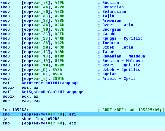 The malware checks the default set language of the user and system using GetUserDefaultUILanguage and GetSystemDefaultUILanguage.