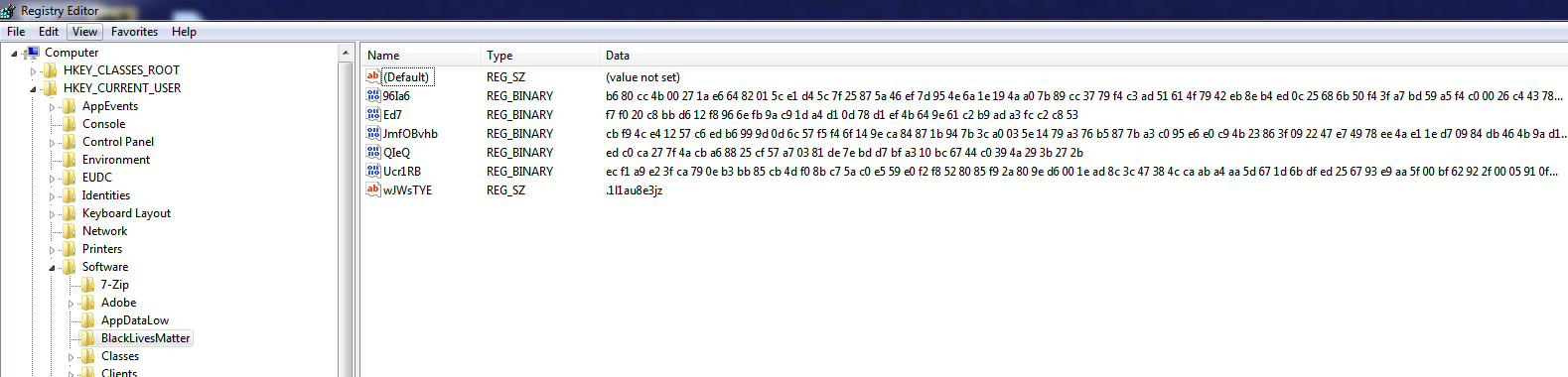 The ransomware will store all generated public / private keys and random file extension ( appended to encrypted files ) during its operation under “SOFTWARE\BlackLivesMatter” reg key. This crucial information can be used later by malware .