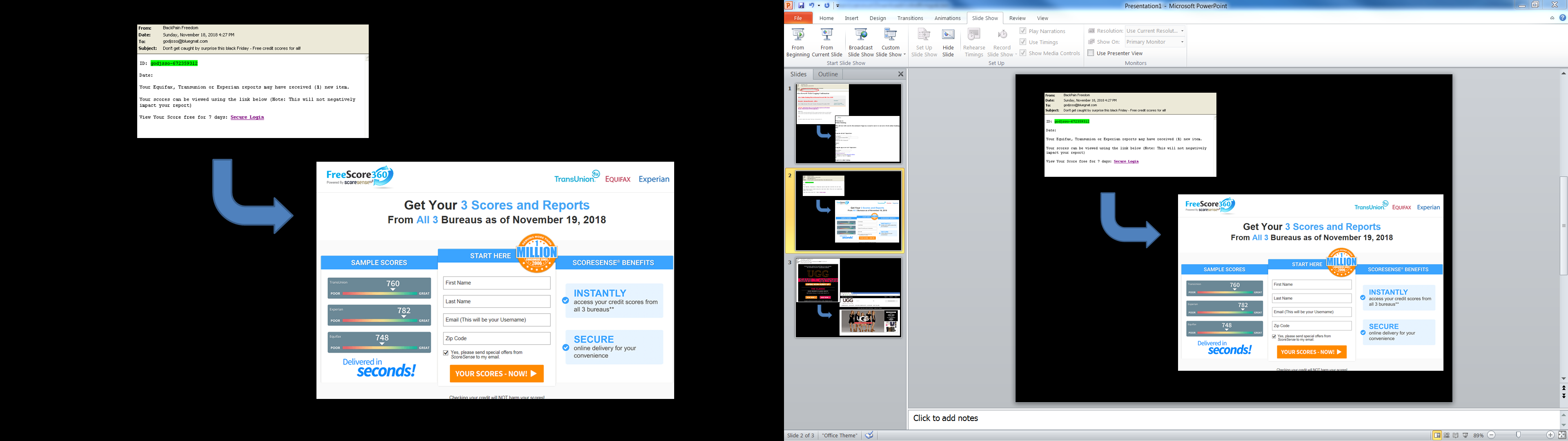 The “free” credit score spam email is similar. Once the victim clicks on the link, he will then be taken to a website asking for his personal information to get “instant access” to his credit scores.