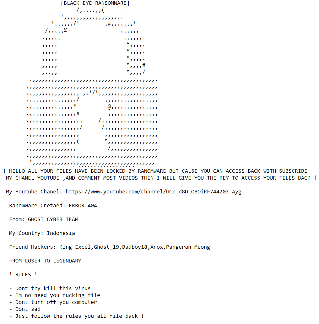 The SonicWall Capture Labs Threat Research team has come across a ransomware with a bizaare demand in exchange for decryption. This ransomware calls itself “Black Eye” but instead of demanding for cryptocurrency as payment, it requires the victim to subscribe to a YouTube channel and to comment on the videos on the said channel.