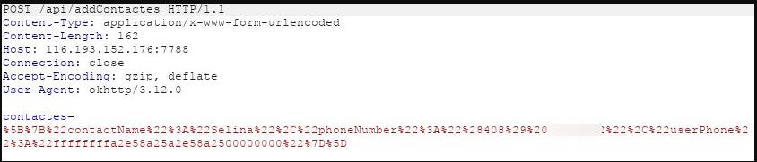 Upon execution the app starts communicating with the attacker using the hardcoded IP 116.193.152.176:7788. The communication happens over http which indicates that any user information sent to the user is done so over an unsecured channel. One of the first things done by the app is creating a unique id for the infected device, this id is saved in the shared_prefs file locally and then shared with the attacker to report the initial infection. This is performed using a POST request to addNewUser as shown below: