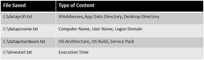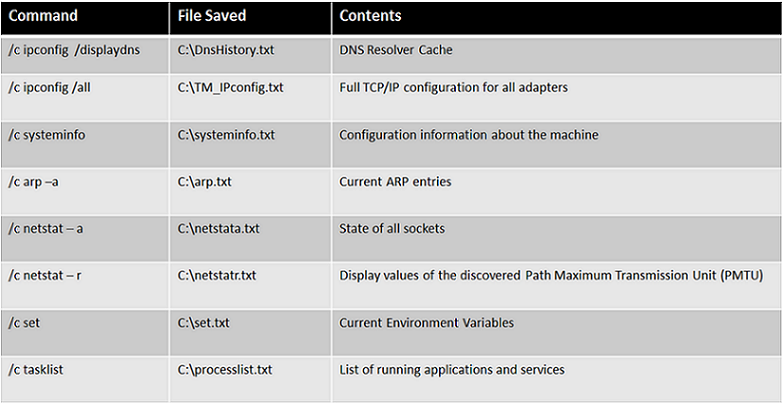 The Worm then starts gathering information about the system and stores this information locally. The Following table shows the commands and corresponding files that save the relevant information: