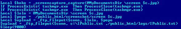 The Dell Sonicwall Threats Research Team received reports of an AutoIt Script compiled Worm that gathers sensitive information from the victim machine and transmits it to a remote server via FTP. The stolen information may include browsing history, device hardware profile, ARP table, network configuration and periodically taken screen captures.