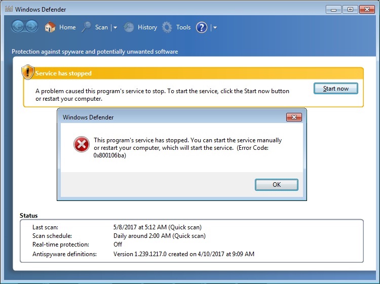 Scanning the provided POC using Windows 7's Windows Defender, we get the following crash notification: