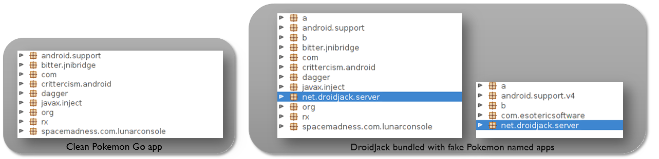 Below is a comparison of the code present in the legitimate Pokemon Go app alongside fake Pokemon Go apps with DroidJack component: