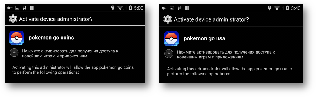 Once installed these adware apps ask for device administrator privileges, the original app does not ask for the same: