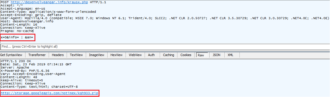 The downloaded archive contains a VBS script file, which when executed, connects to a C&C server (hxxp://desenvolveangar.info /?tgow=shuran&). The C&C server has put in a mechanism to identify whether a request is from a bot or an automated system. If a specific pattern is found in the HTTP request header “USER-AGENT: COOLDOWN”  and the data “Z”, then only the next stage malicious file (encoded to evade detection) is sent otherwise the request is served with an image file as shown below: