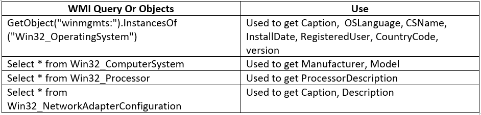 The script extensively uses sleep method, which could make the available sandboxing and emulation technologies futile. It uses Windows Management Instrumentation (WMI) framework to collect victim’s system information as shown in the table below: