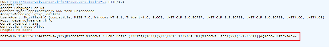 The malware continues with its data collection and other activities. It collects data like system’s manufacturer, model, network adapter configuration caption and description, which is later sent to the C&C Server as shown below: