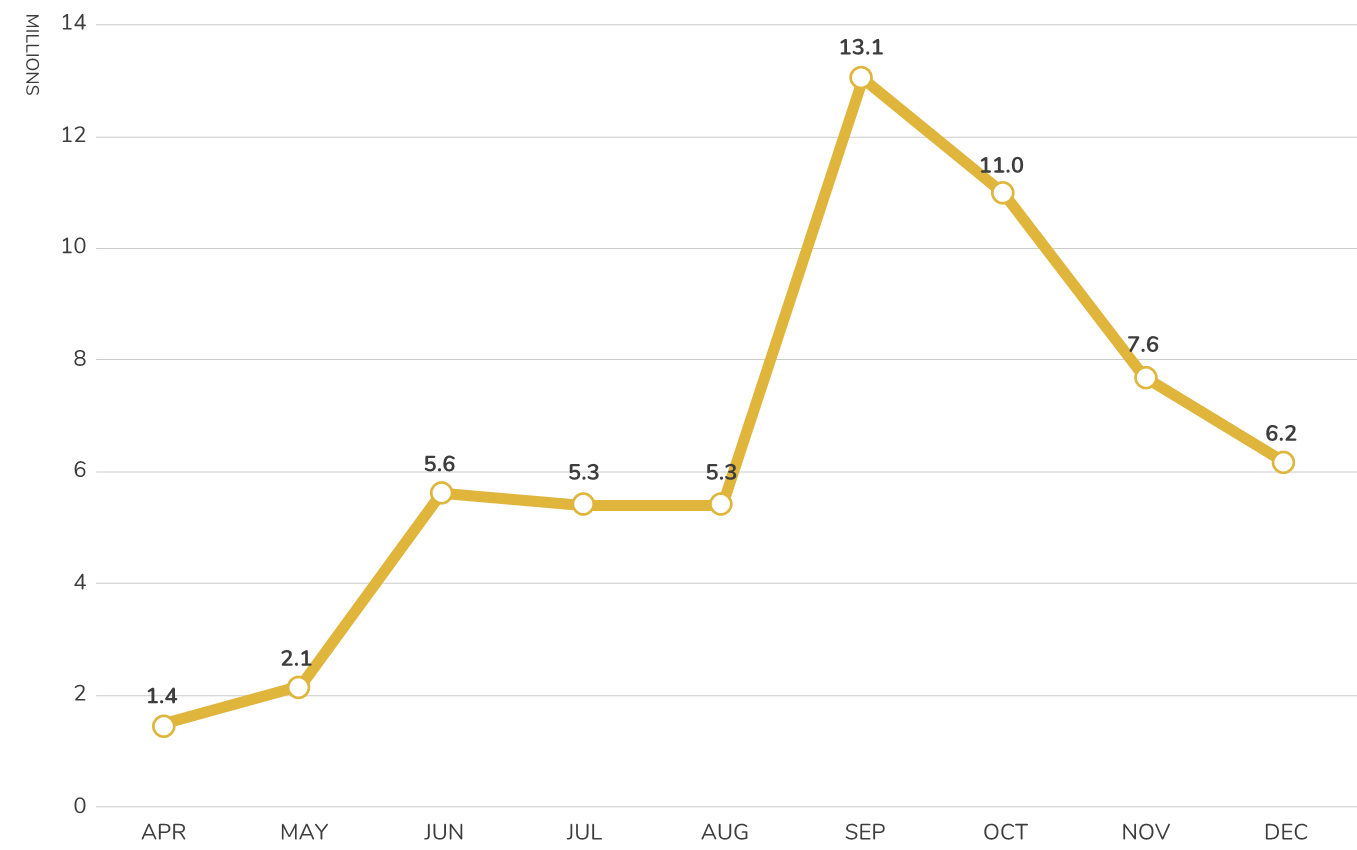 Em abril de 2018, a SonicWall começou a acompanhar as tendências do cryptojacking, mais precisamente a utilização do Coinhive no malware. Ao longo do ano, observamos o recuo e o avanço do cryptojacking. Durante esse tempo, a SonicWall registrou quase 60 milhões de ataques de cryptojacking, com até 13,1 milhões em setembro de 2018. Conforme publicado no Relatório de Ameaças Cibernéticas da SonicWall 2019, o volume caiu durante o último trimestre de 2018.