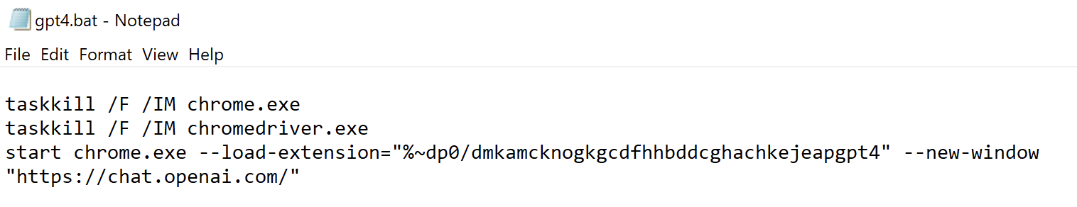 But silently, it spawned the command prompt to run the batch file named gpt4.bat which started the Chrome browser and loaded a browser extension named "dmkamcknogkgcdfhhbddcghachkejeapgpt4."