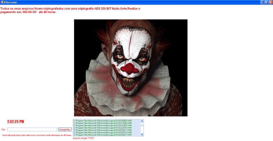 Upon successful infection, KillerLocker opens a window with the clown image and a warning.