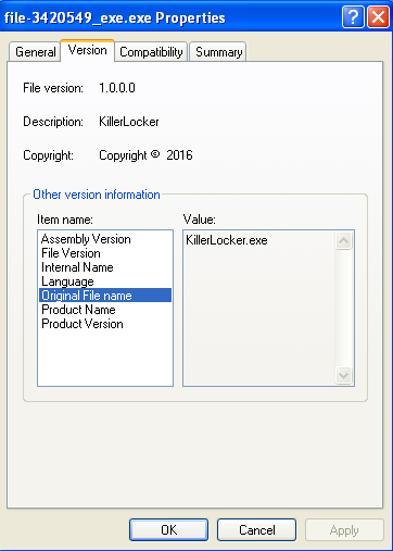 Figure 1: KillerLocker file properties clearly says "killerlocker"